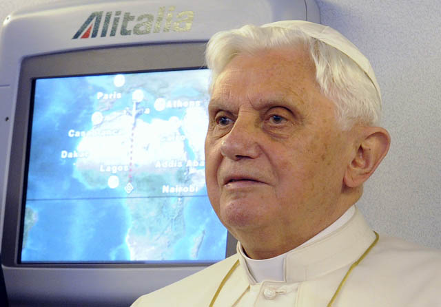 Pope Benedict listens to journalists on the flight from Rome to Cameron. (CNS photo/Alessandro Bianchi, Reuters)