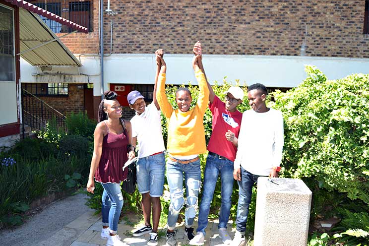 Learners from Immaculata High School in Soweto wait to receive their results. (From left) Vuyelwa Baloyi, Banele Motshoeneng, Khumi Phoko, Vuya Ntloko, and Sicelo Nguyuza. The school had a 99% pass rate and achieved more than 50 distinctions.