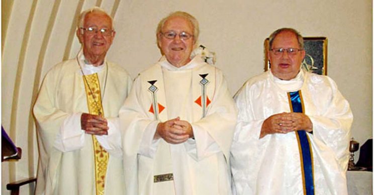 Leading theologian Fr Anselm Prior OFM (centre) celebrated the golden jubilee of his ordination to the Franciscan priesthood in the chapel at Holy Cross Home in Suiderberg, Pretoria, with Archbishop Emeritus George Daniel (left) and chaplain Fr Terry Duurland.