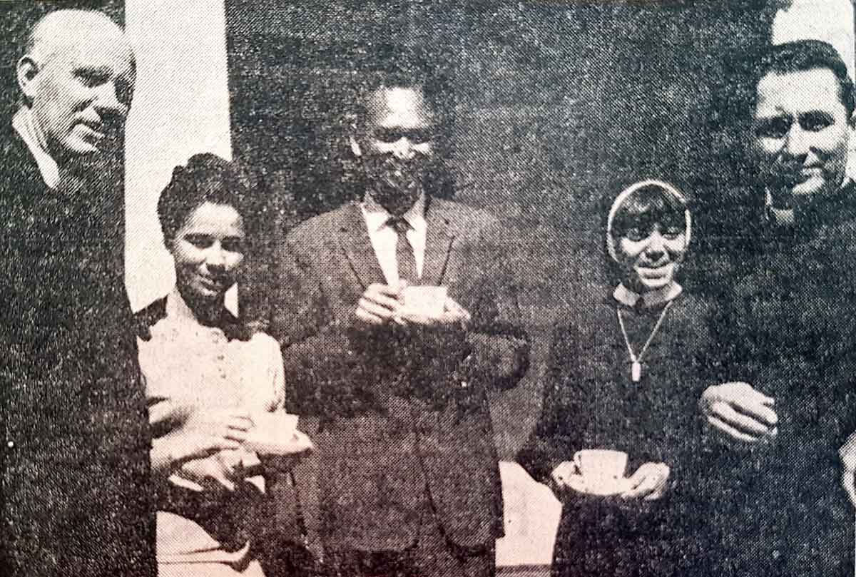 Fr De Hahn (right) in 1967 after a teachers’ Mass with (from left) Fr J Duffy SDB and teachers Sybil Jacobs (Retreat), Lawrence “Kingsize” Kalipa (Nyanga) and Maureen Martin (Parow).