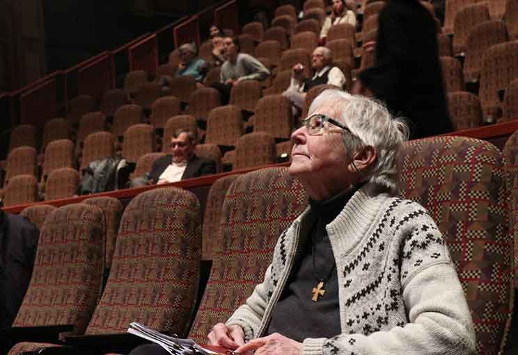 Sister Megan Rice, a member of the Society of the Holy Child Jesus, looks up at the movie screen in the DeBartolo Performing Arts Center at the University of Notre Dame in South Bend, Ind. Sister Rice was awaiting the screening of a new documentary about her anti-nuclear activism called “The Nuns, The Priests and The Bombs.” (CNS photo/Katie Rutter)
