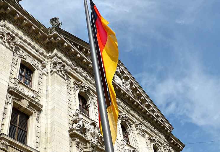 The German flag is seen outside the Ministry of Justice in Munich. German police and prosecutors are launching investigations into clergy sexual abuse following the Sept. 12 leak of a report containing evidence of 3,700 alleged child sex abuse cases in the Catholic Church over a 68-year-period. (CNS photo/Zita Ballinger Fletcher)