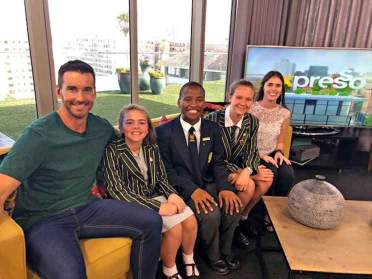 Senior school students at CBC St John’s Parklands in Cape Town helped pack 25 000 meals for Rise Against Hunger at Table Bay Mall. Three students and one teacher joined SABC3’s Espresso morning show team in the studio to help with the last 1000 meals, to reach the final target of 100000. Seated on the Expresso couch with presenter Graeme Richards are (left to right) Isabella Pietersen, John Graayenstein, Paije Flood, and staff member Kaylee Lewis.