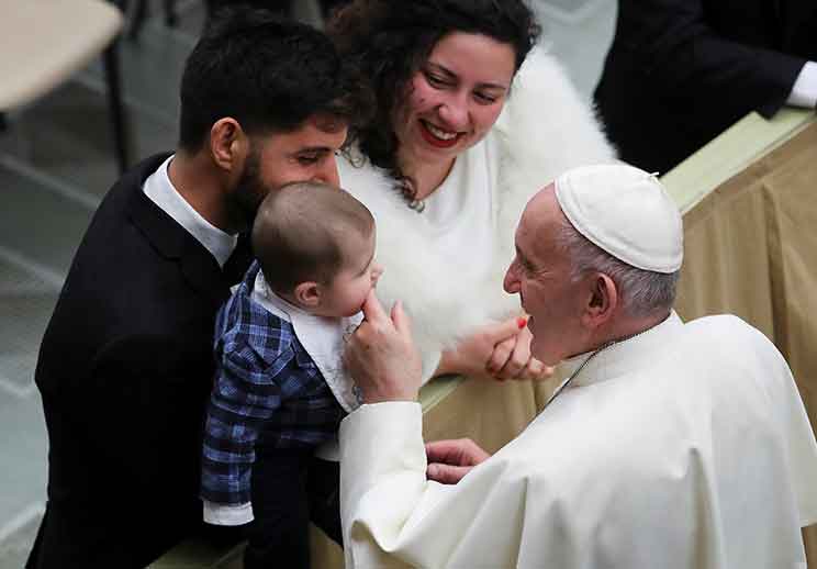 Pope Francis plays with a baby during his general audience in Paul VI hall at the Vatican. (CNS photo/Philimon Bulawayo, Reuters