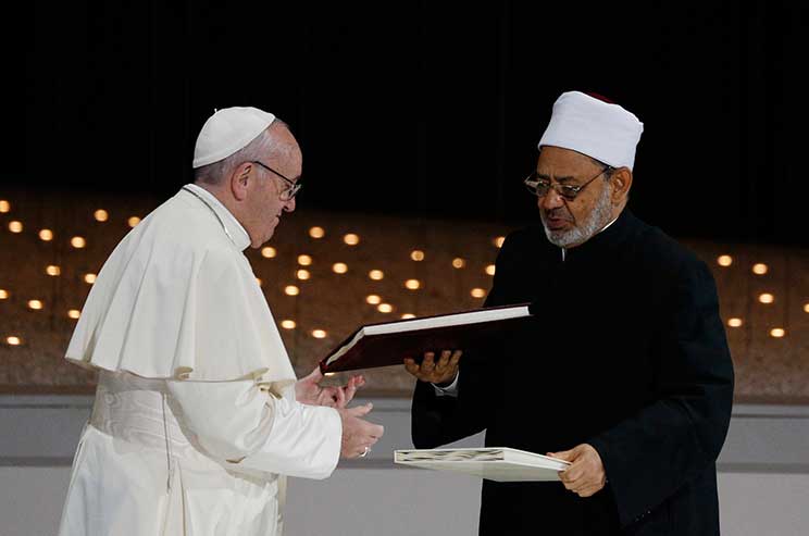 Pope Francis and Sheik Ahmad el-Tayeb, grand imam of Egypt’s al-Azhar mosque and university, exchange documents during an interreligious meeting at the Founder’s Memorial in Abu Dhabi, United Arab Emirates, (CNS photo/Paul Haring)