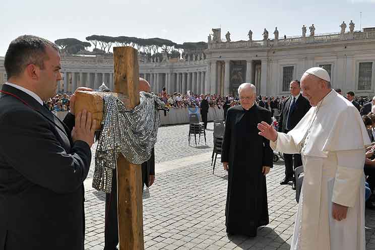 Pope Francis blesses a wooden cross during his general audience in St. Peter’s Square at the Vatican. (CNS photo/Vatican Media)