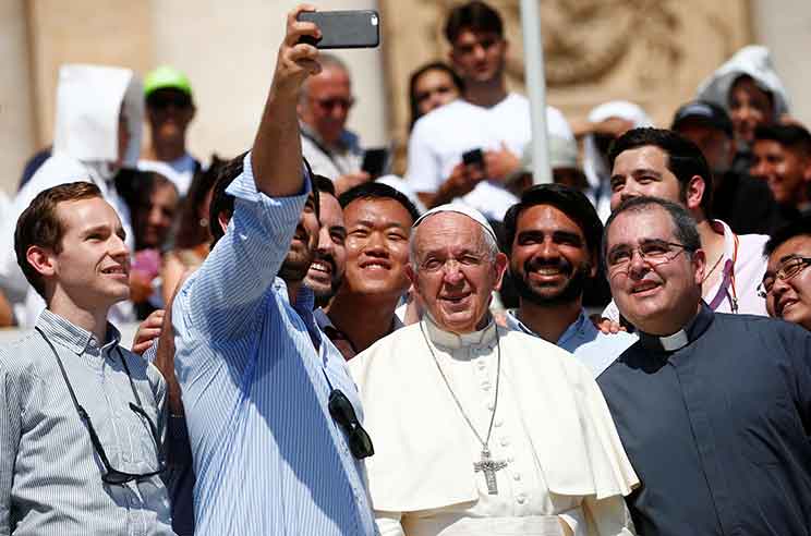 A man takes a selfie with Pope Francis and other pilgrims during his general audience in St. Peter’s Square at the Vatican. (CNS photo/Yara Nardi, Reuters)