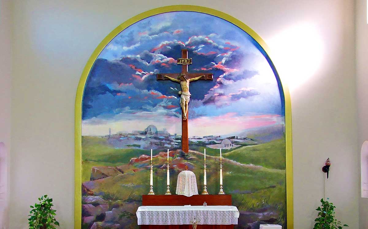 This month, parishioners of Eucharistic Heart of Jesus church in Cambridge, East London, arrived for Mass to see a new mural of clouds behind the old crucifix. Parish priest Fr Varghese Kannanaickal CMI explained that the white and red recall the rays in The Divine Mercy painting: the red for blood and white for water. The dark clouds signify the day on which Jesus was crucified, but in the distance towards Jerusalem the sky is clearing to symbolise Christ’s defeat of death and the hope this brings us. The brightness at the bottom of the crucifix indicates the resurrection of Christ: darkness will not prevail; dawn is coming and the brightness of the resurrection will prevail forever. (Photo from Sharron Reynolds)