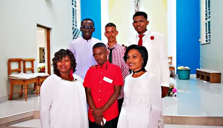 Four RCIA candidates, with parish priest Fr Callistus Nwosu SDV, who made their commitment to the Church at St Kevin’s parish in Windvogel, Port Elizabeth. They are (front from left) Tarryn Booysen, Kenan Fortune and Catherine Merringhton and (back from centre) Lee-roy Pietersen and Sharlton Fortune. (Submitted by Jolindon Petersen)