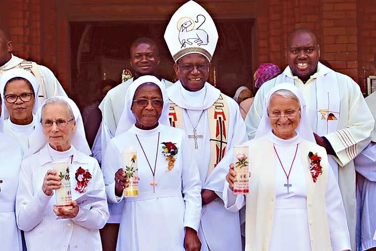 The celebrating nuns are pictured with (back from left) provincial superior Sr Immaculate Ndlovu, a CMM novice from Zambia, Bishop Pius Dlungwane, and Fr Mthembeni Mtambo, assistant priest of St Joseph’s cathedral. (Submitted by Sr Fadzai CPS)