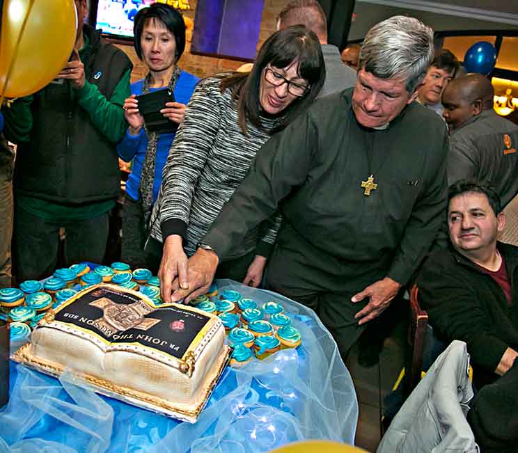 Fr John Thompson SDB cuts a cake to mark his 40th anniversary of ordination, with the help of the baker, at Robertsham parish in Johannesburg. (Photo: Sheldon Reddiar)