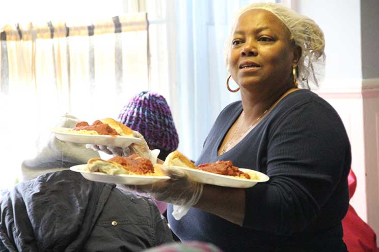 Elaine Nelson, food service manager at Mercy Hospice in Philadelphia, dishes out hot plates of spaghetti and meatballs to guests at the Catholic Social Services facility for homeless women and their children in this Feb. 12, 2014, photo. (CNS photo/Sarah Webb, CatholicPhilly.com)