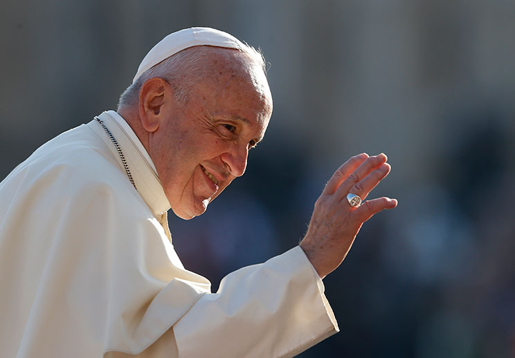 Pope Francis greets the crowd during his general audience in St Peter’s Square at the Vatican. (CNS photo/Paul Haring)