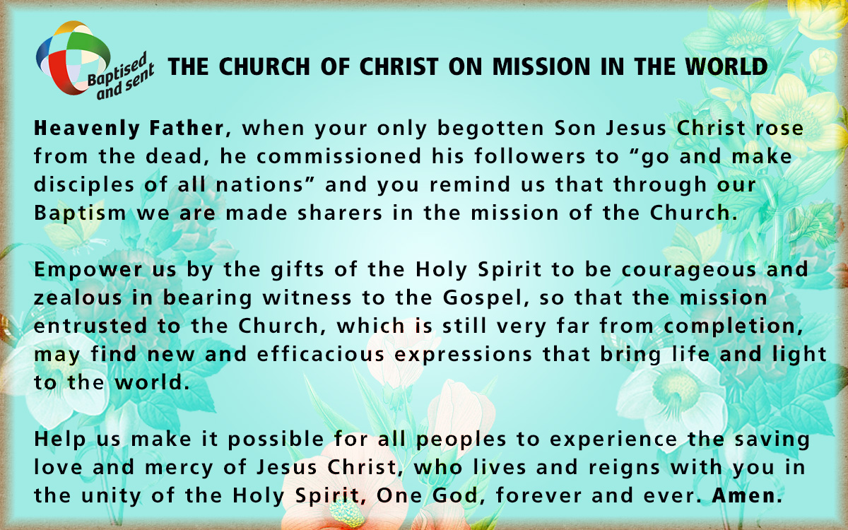 Heavenly Father, when your only begotten Son Jesus Christ rose from the dead, he commissioned his followers to “go and make disciples of all nations” and you remind us that through our Baptism we are made sharers in the mission of the Church.