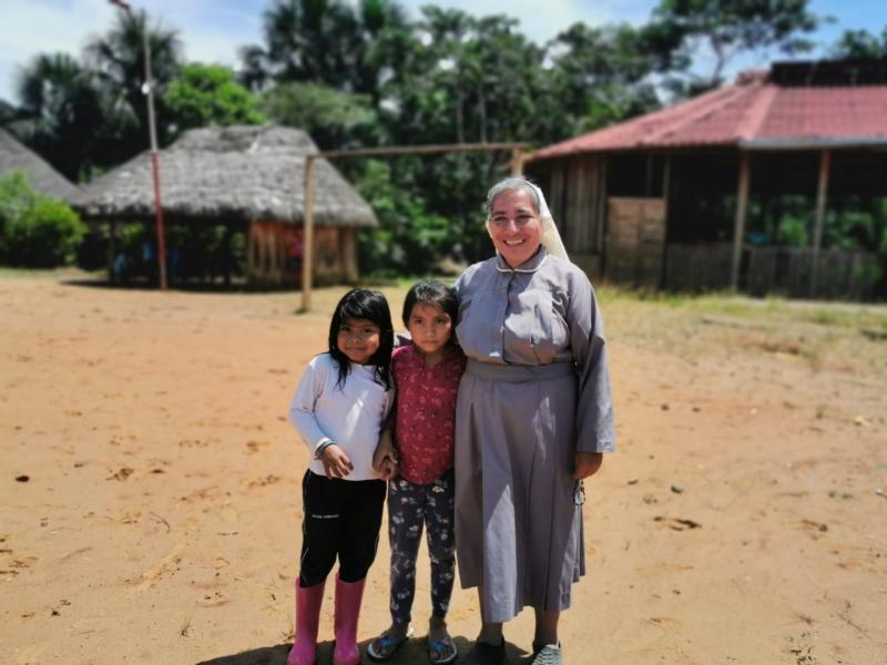 Sister Rosa Elena Pico, a member of the Missionaries of Mary Co-Redemptrix, poses for a photo with children from the indigenous community of Sarayaku, Ecuador. While the Catholic Church has made strides to include the voice of women, especially in the Synod of Bishops for the Amazon, women should be included among synod voting members and in church leadership positions, a German theologian said .(CNS photo/Junno Arocho Esteves)
