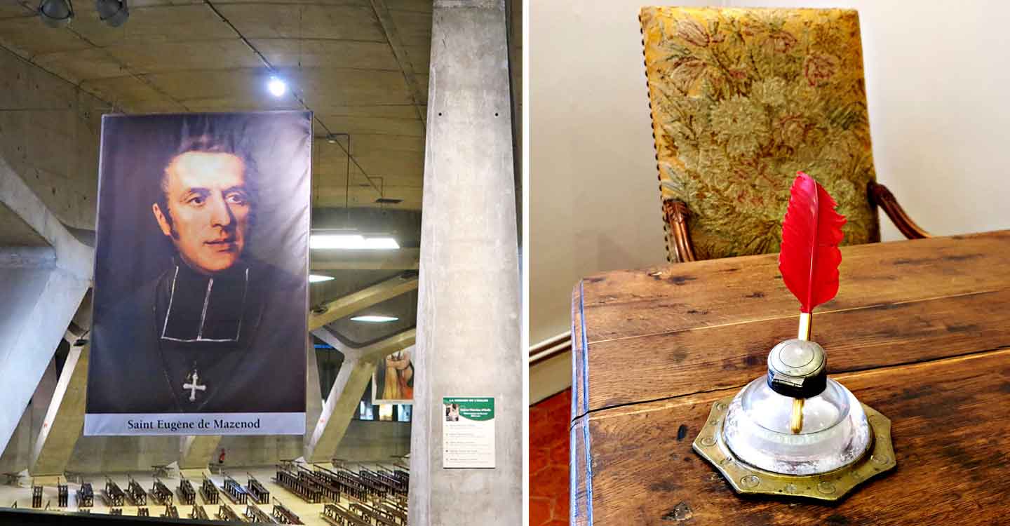 An image of St Eugène de Mazenod is displayed in Lourdes’ St Pius X basilica • The chair, table and quill of St Eugène in his study in Aix-en-Provence