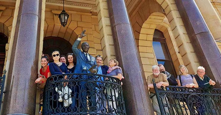 Posing with a sculpture of Nelson Mandela on the balcony of Cape Town’s City Hall were members of a group of the German association of Catholic communicators. The group met with Catholic journalists and experts, and visited several projects. The balcony is where Mr Mandela held his first public speech after he was released from prison in February 1990.