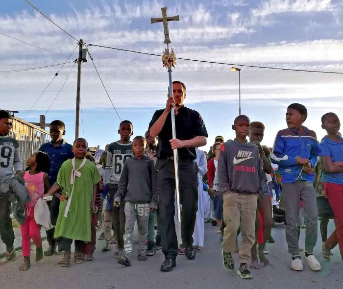 The procession, which was made up of priests, seminarians and dozens of families of the Neocatechumenal Way in Cape Town, including missionary families from India, Italy, Portugal and South Africa. They played instruments, sang Christmas songs and stopped at several spaza shops to ask if they had place for Mary and Joseph to lodge — much to the bemusement of the residents who trailed along.