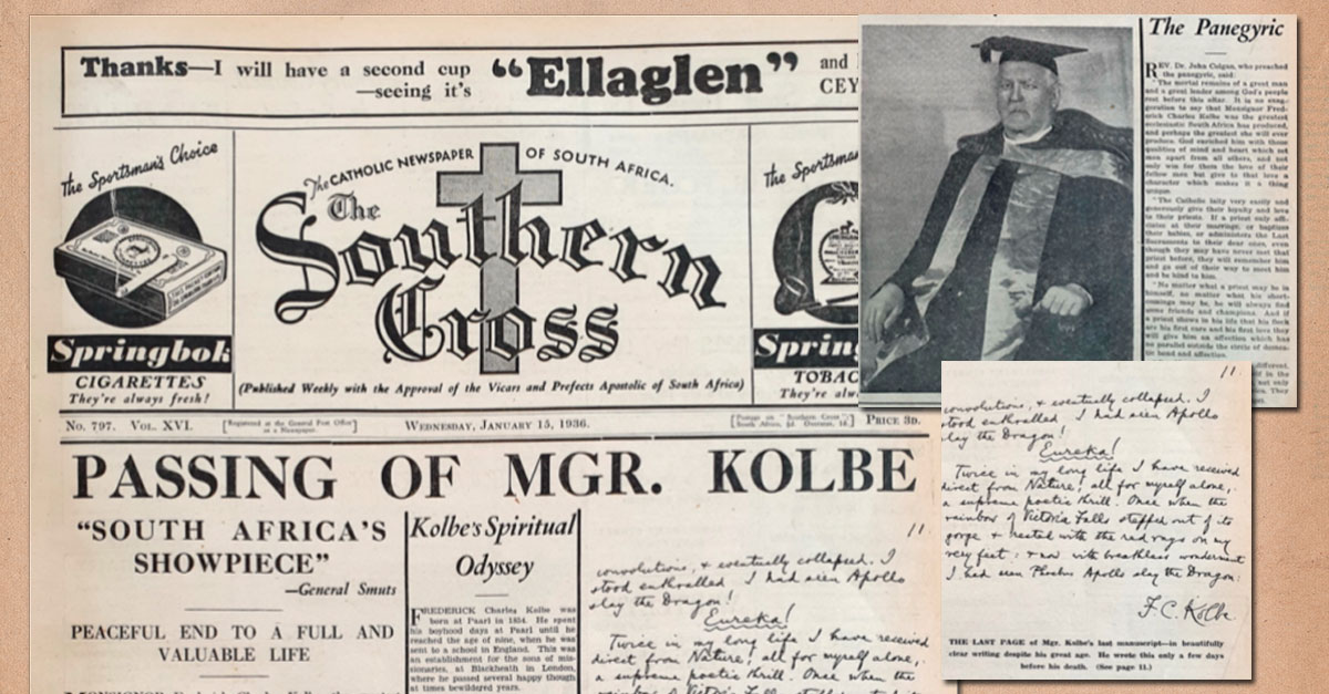 The great Churchman Mgr Frederick Kolbe has died in Cape Town, aged 82. Known to generations of Catholic children as “Uncle Joe”, Mgr Kolbe retained his faculties until the end, even following every phrase of the service before the viaticum with great interest. He had finished his last article for The Southern Cross, titled “How Phoebus Apollo slew the dragon”, only a few days before his death. The son of a Congregational minister, he had converted to Catholicism in 1877 and was ordained to the priesthood in 1882.