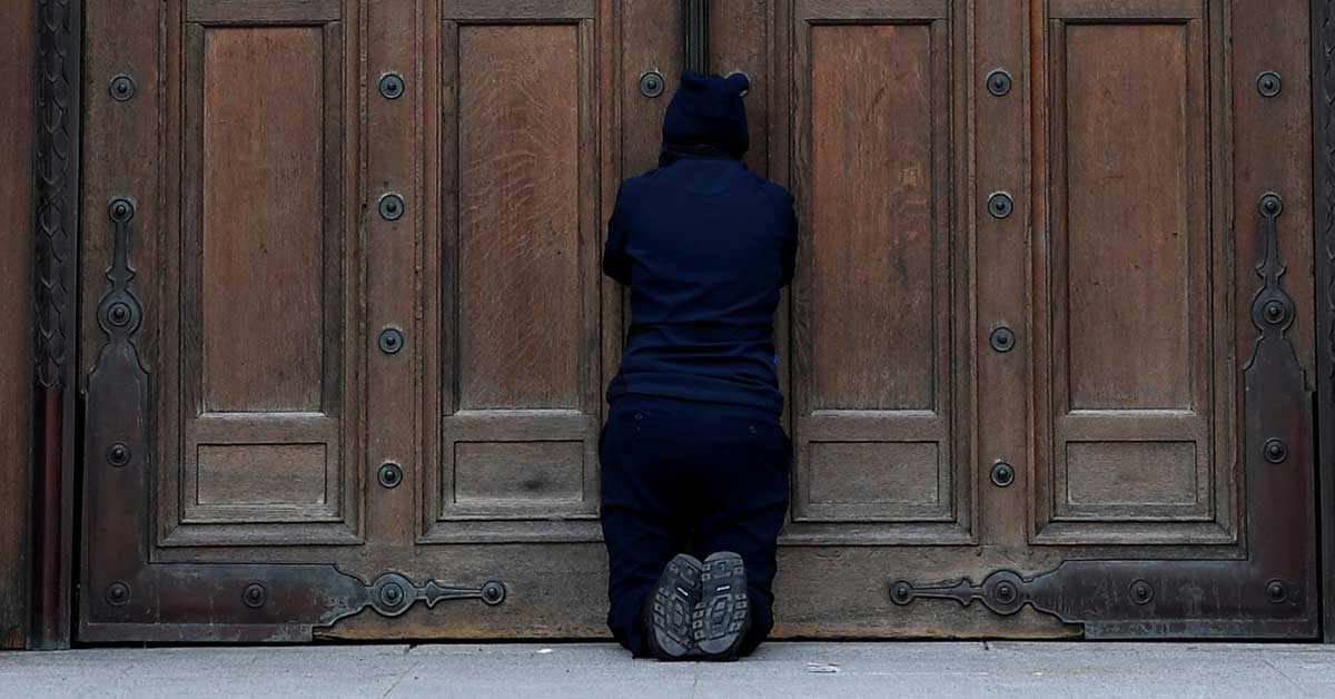 A person prays at the closed doors of London’s Westminster Cathedral on Easter, April 12, 2020, during the COVID-19 pandemic. Churches in England and Wales must wait until July before they may reopen under a coronavirus recovery strategy published by the government. (CNS photo/Toby Melville, Reuters)