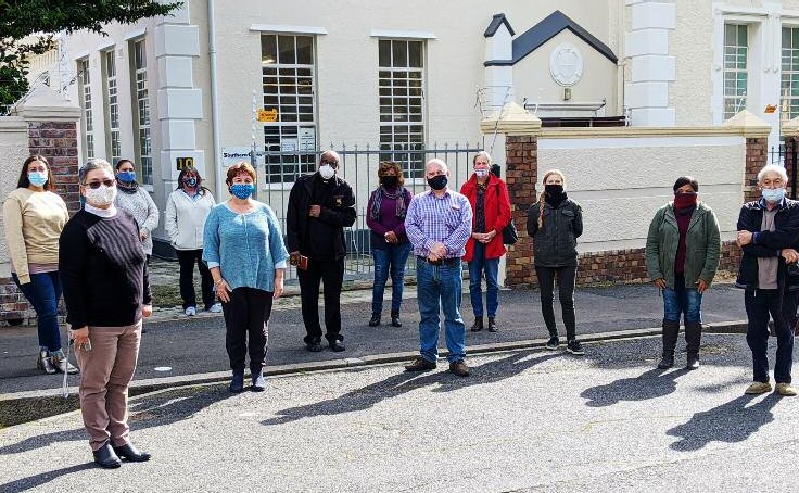 Staff say farewell. (From left): Erin Carelse, Pamela Davids, Desirée Chanquin, Michelle Perry, Rosanne Shields (chair of the board), Bishop Sylvester David, Jean van der Westhuizen, Günther Simmermacher, Mary Leveson, Claire Allen, Yolanda Timm, and Sidney Duval (director). (Photo: Claire Mathieson)