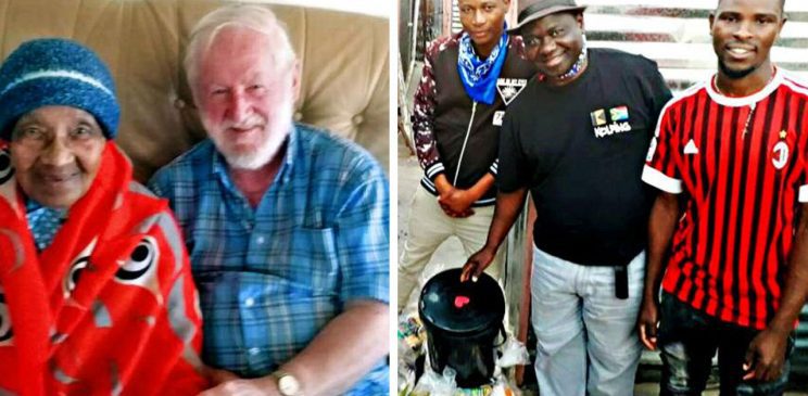(left) Fr Dick O’Riordan, the author of this article, with a friend. (Right) Fr Kizito Gugah of Tafelsig (centre) is seen bringing food to people in need.
