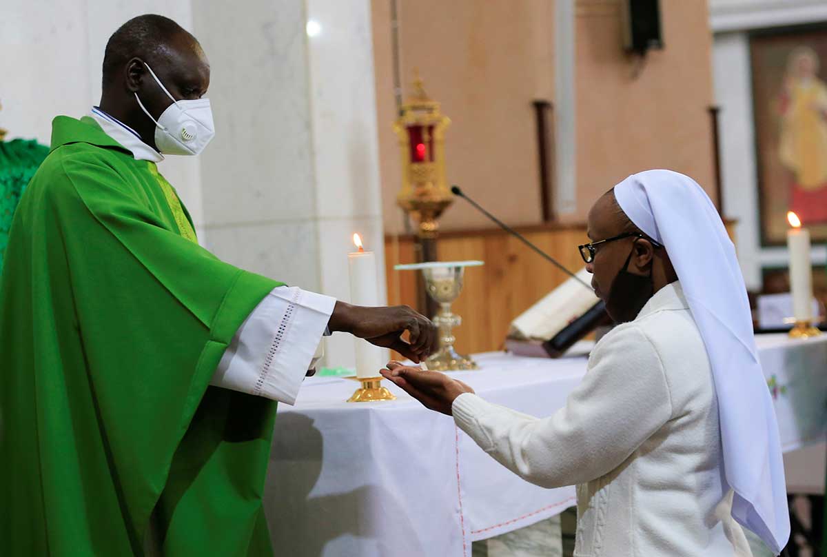 A priest wearing a face mask gives Communion to a woman religious during Mass at the Cathedral Basilica of the Holy Family in Nairobi, Kenya, on the first day the government allowed churches to reopen for worship during the coronavirus pandemic. The Vatican issued a new instruction on pastoral care that emphasises the role of lay men and women in the church’s mission, but said most parishes must be led by priests. (CNS photo/Thomas Mukoya, Reuters)