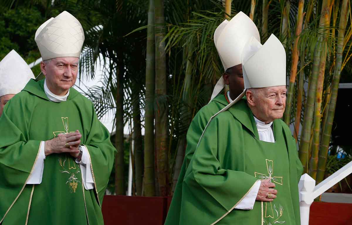Cardinal Pietro Parolin, Vatican secretary of state, and then-Cardinal Theodore E. McCarrick arrive for Pope Francis’ celebration of Mass in Revolution Square in Havana Sept. 20, 2015. (CNS photo/Paul Haring)