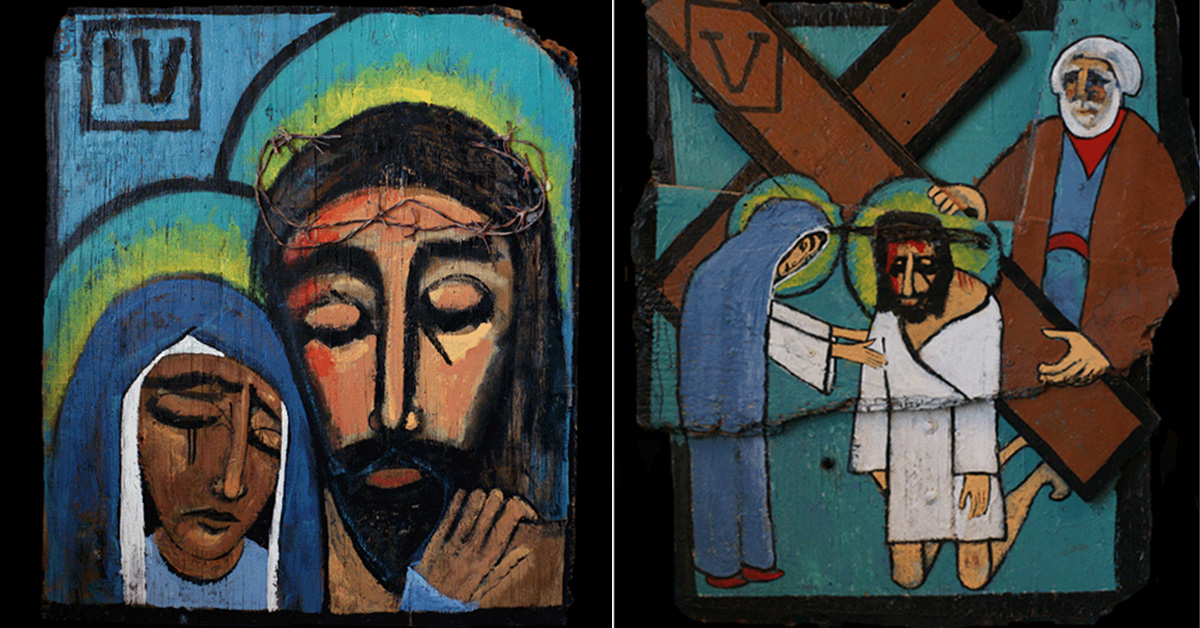 It is this broken figure who is met by his mother in the next Station, no 4. The compassion and anguish of a mother for a son are expressed in the two faces painted on boards, their eyes closed in grief.