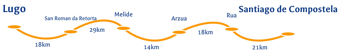 With one exception, daily routes are between 15-20km in length. The longest day, between San Roman da Retorta and Melide is 28,6km (but on flat terrain). Everybody may walk at their own pace, and rest when they wish to. The paths are well-marked, and after Melide other routes join up, so there will be many other peregrinos to guide the way.