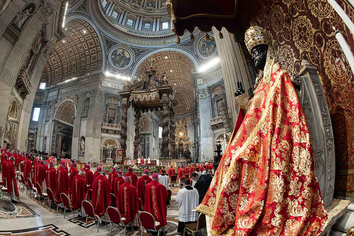 The statue of St. Peter is seen as Pope Francis celebrates Mass on the feast of Sts. Peter and Paul in St. Peter’s Basilica at the Vatican June 29, 2021. (CNS photo/Vatican Media)