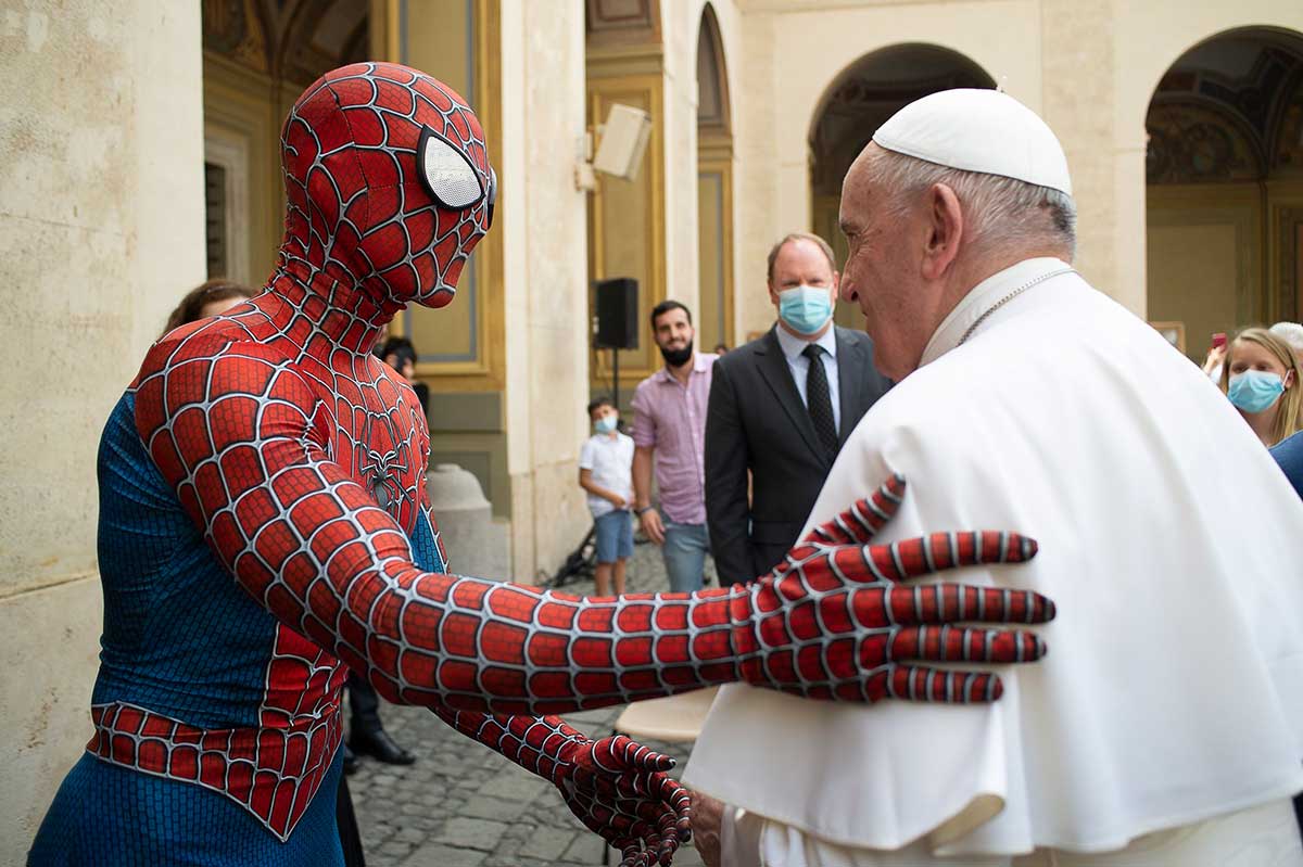 Pope Francis greets Mattia Villardita, 27, from northern Italy, dressed as Spider-Man, during his general audience in the San Damaso Courtyard of the Apostolic Palace at the Vatican June 23, 2021. The pope began a new series of audience talks focused on St Paul’s Letter to the Galatians and its lessons about evangelisation, faith and freedom. (CNS photo/Vatican Media)
