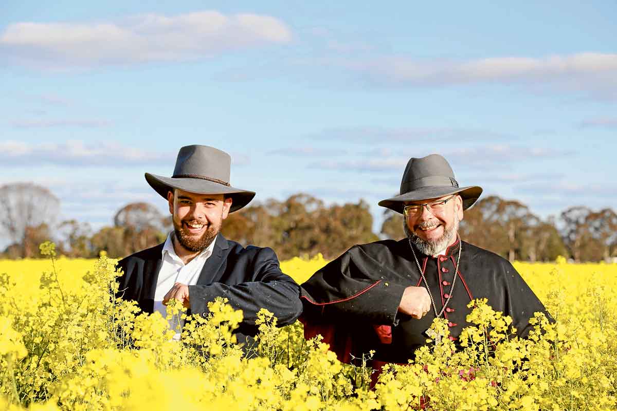 Hugo Ditroia, chancellor of the Australian Diocese of Wilcannia-Forbes, and Bishop Columba Macbeth-Green bump elbows amid a crop of canola in the vast outback diocese Sept. 31, 2020. The diocese has announced the planned construction of what it believes will be the world’s first Catholic school named for Blessed Carlo Acutis, an Italian teenager who died in 2006 and was beatified by Pope Francis in 2020. (CNS photo/Diocese of Wilcannia-Forbes via The Catholic Weekly)