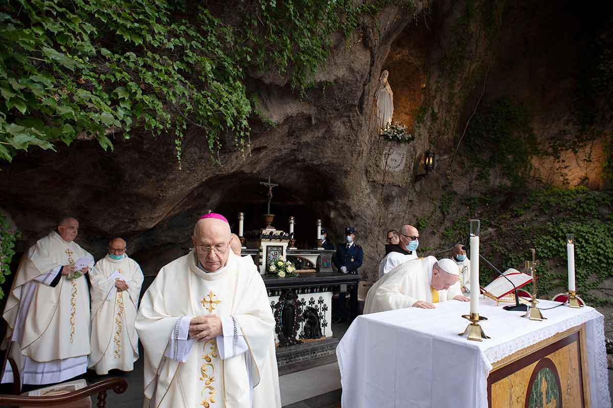 Pope Francis kisses the altar as he celebrates Mass for the Vatican police force, known as the gendarme, in the Lourdes grotto of the Vatican Gardens Oct. 2, 2021. Hostility, conflict, war are all fruit of the devil, the pope told Vatican police in his homily. (CNS photo/Vatican Media)