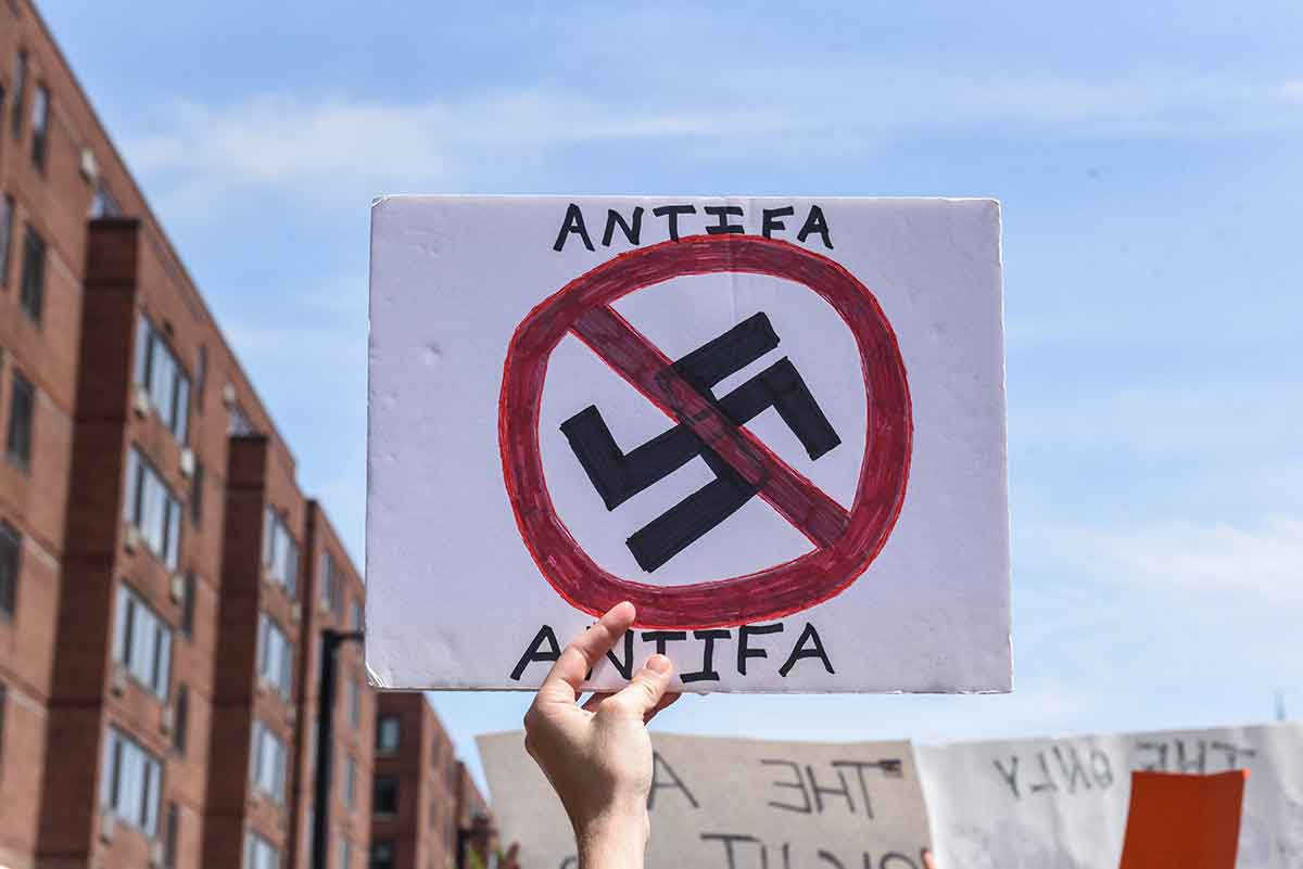 An anti-fascist placard is seen in Boston Aug. 19, 2017. (CNS photo/Stephanie Keith, Reuters)