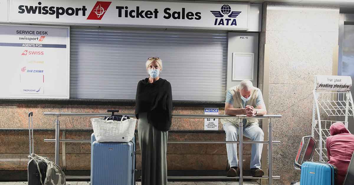 Passengers wait for confirmation of flights outside the closed Swissport Ticket Sales counter at O.R. Tambo International Airport in Johannesburg Nov. 28, 2021, as several airlines stopped flying out of South Africa amid the spread of the omicron variant. Travel bans on southern Africa are based on “a deep-seated racism” and have a severe impact on the poor in the region, where many livelihoods depend on the tourism industry, said a prominent Jesuit. (CNS photo/Sumaya Hisham, Reuters)