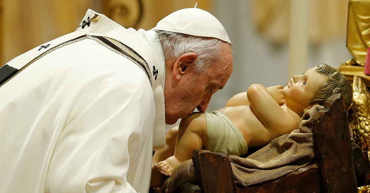 Pope Francis kisses a figurine of the baby Jesus at the start of Christmas Eve Mass in St. Peter’s Basilica at the Vatican on Dec. 24, 2021. (CNS photo/Paul Haring)
