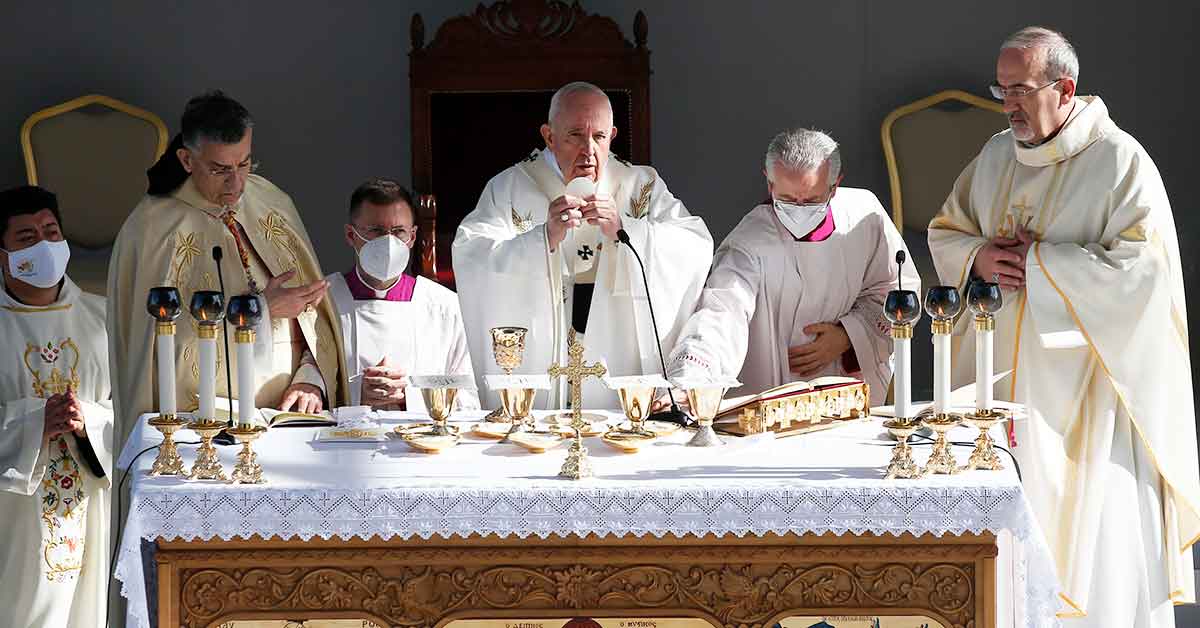 Pope Francis elevates the Eucharist as he celebrates Mass at the GSP Stadium in Nicosia, Cyprus, Dec. 3, 2021. (CNS photo/Paul Haring)