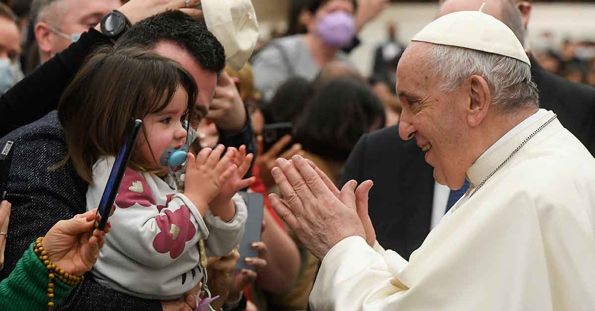Pope Francis greets a young girl after his weekly general audience Dec. 29, 2021, in the Vatican’s Paul VI hall. (CNS photo/Vatican Media)