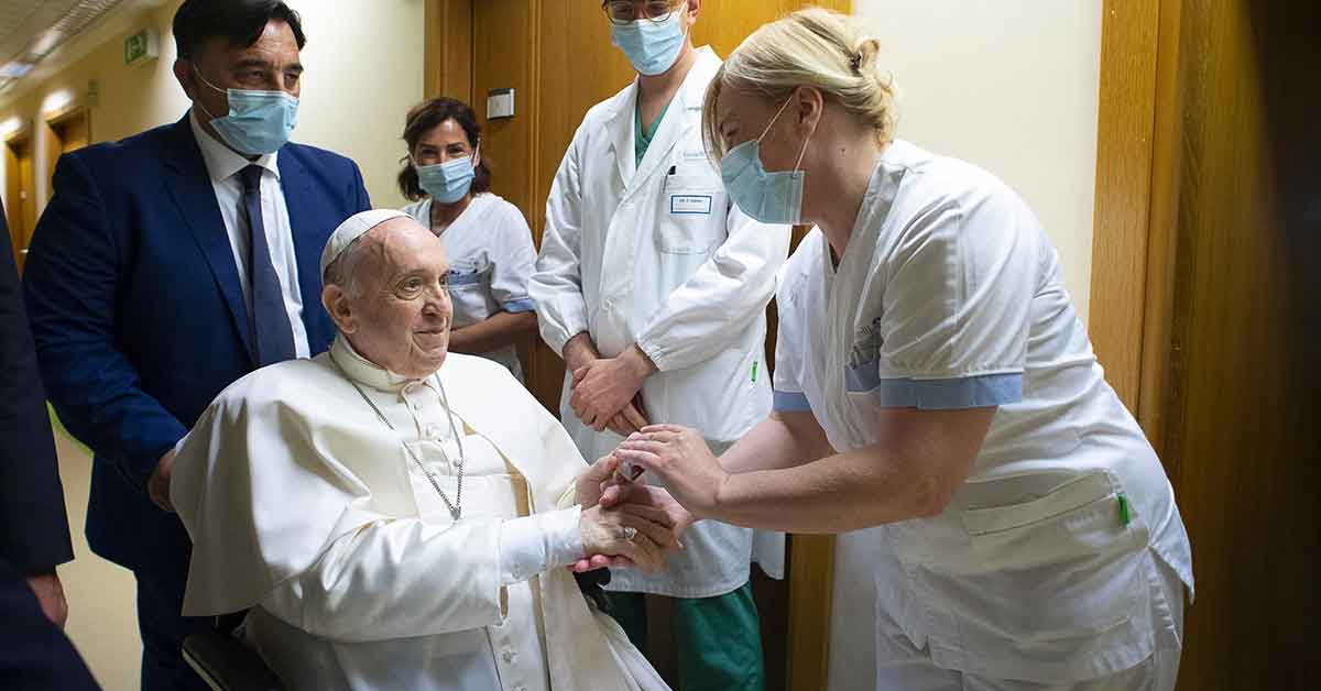 Pope Francis gives a rosary to a member of the medical staff at Gemelli hospital in Rome on July 11, 2021, as he recovers following scheduled colon surgery. The pope was in the hospital for 10 days. (CNS photo/Vatican Media via Reuters)