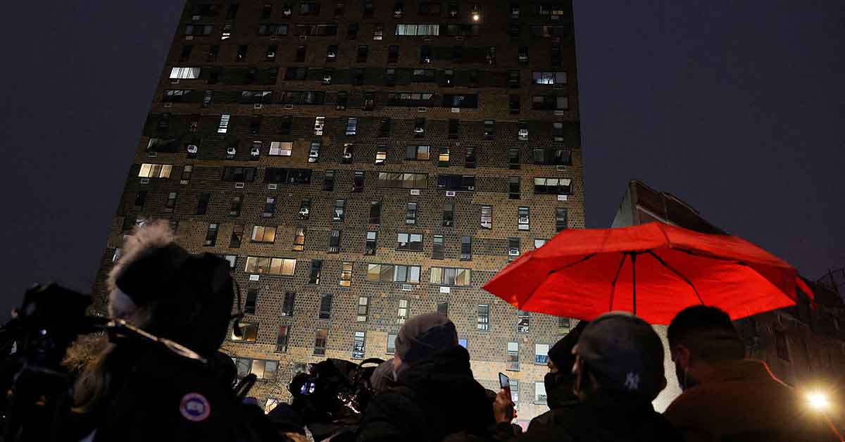 People in the Bronx borough of New York City stand outside an apartment building where a fire occurred Jan. 9, 2022. Pope Francis sent his condolences to families of the 17 people killed in the fire. (CNS photo/Andrew Kelly, Reuters)