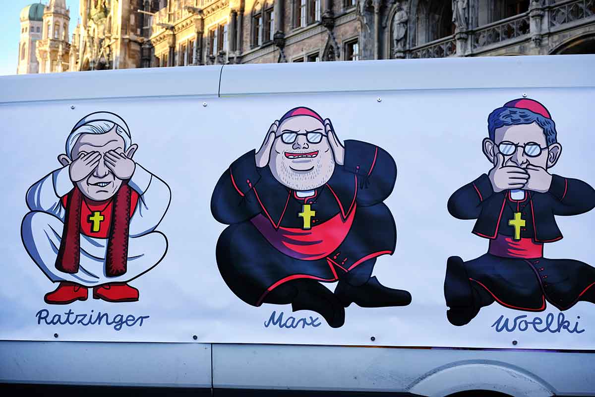 A large poster is attached to a van in Munich Jan. 19, 2022, depicting retired Pope Benedict XVI, Cardinal Reinhard Marx of Munich and Freising, and Archbishop Rainer Maria Woelki of Cologne, during a demonstration in protest of the church’s handling of sexual abuse. (CNS photo/Dieter Mayr, KNA)