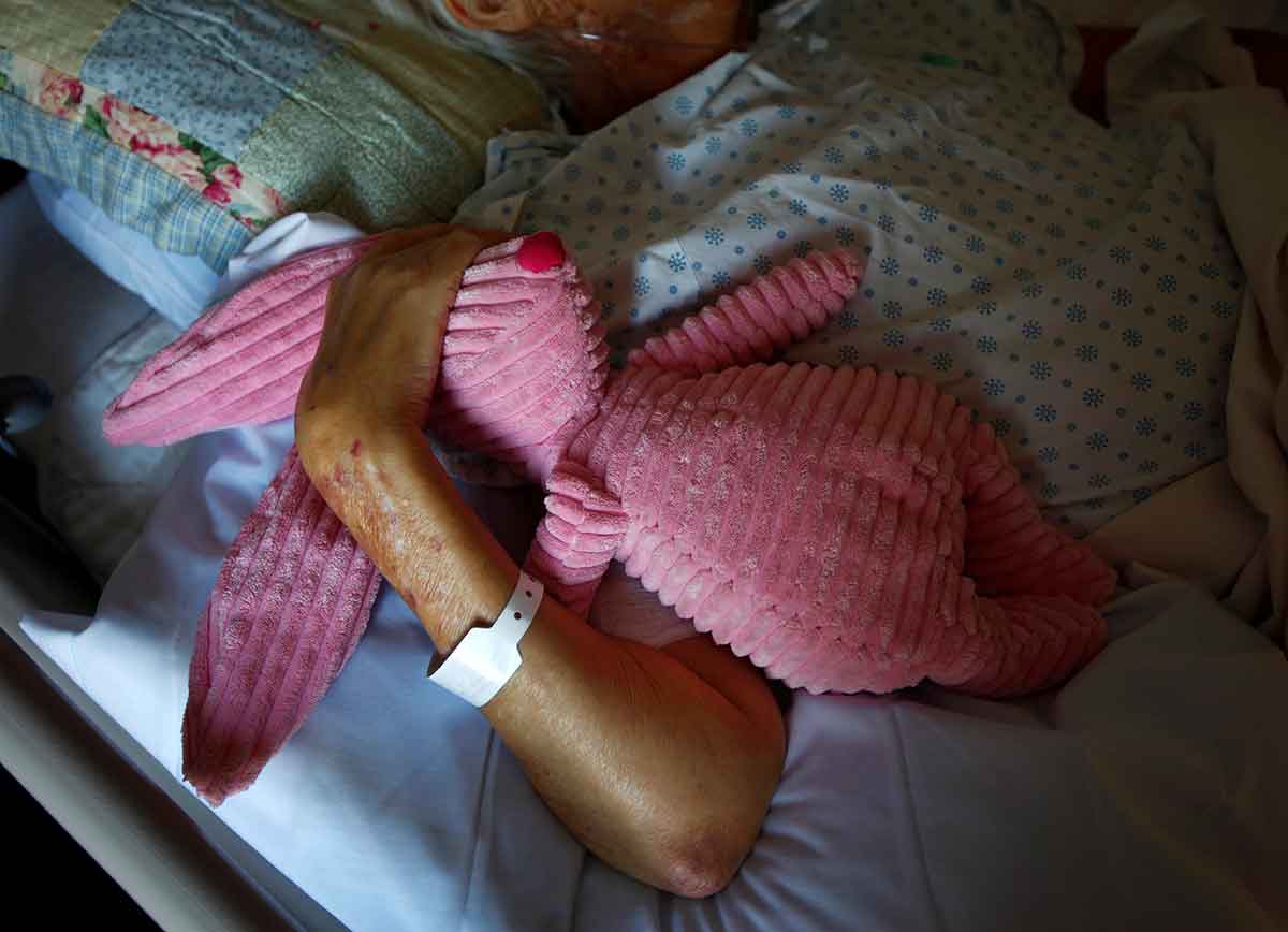 A dying cancer patient holds a stuffed animal during her final hours at a palliative care hospital in Winnipeg, Manitoba, in this July 24, 2010, file photo. Pope Francis recently spoke about the Christian attitude toward death, saying it must be accepted but not provoked. (CNS photo/Shaun Best, Reuters)