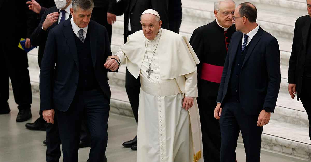 Pope Francis holds the arm of his aide, Sandro Mariotti, was he walks during his general audience in the Paul VI hall at the Vatican in this Jan. 26, 2022, file photo. The Vatican announced that the pope will not travel to Florence Feb. 27 because of severe knee pain. (CNS photo/Paul Haring)
