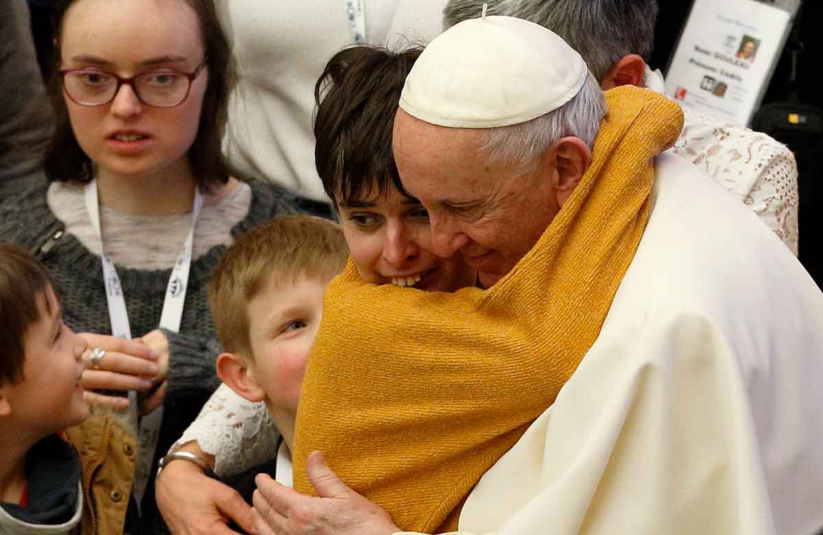 Pope Francis embraces a young woman during his general audience in the Paul VI hall at the Vatican Feb. 9, 2022. (CNS photo/Paul Haring)