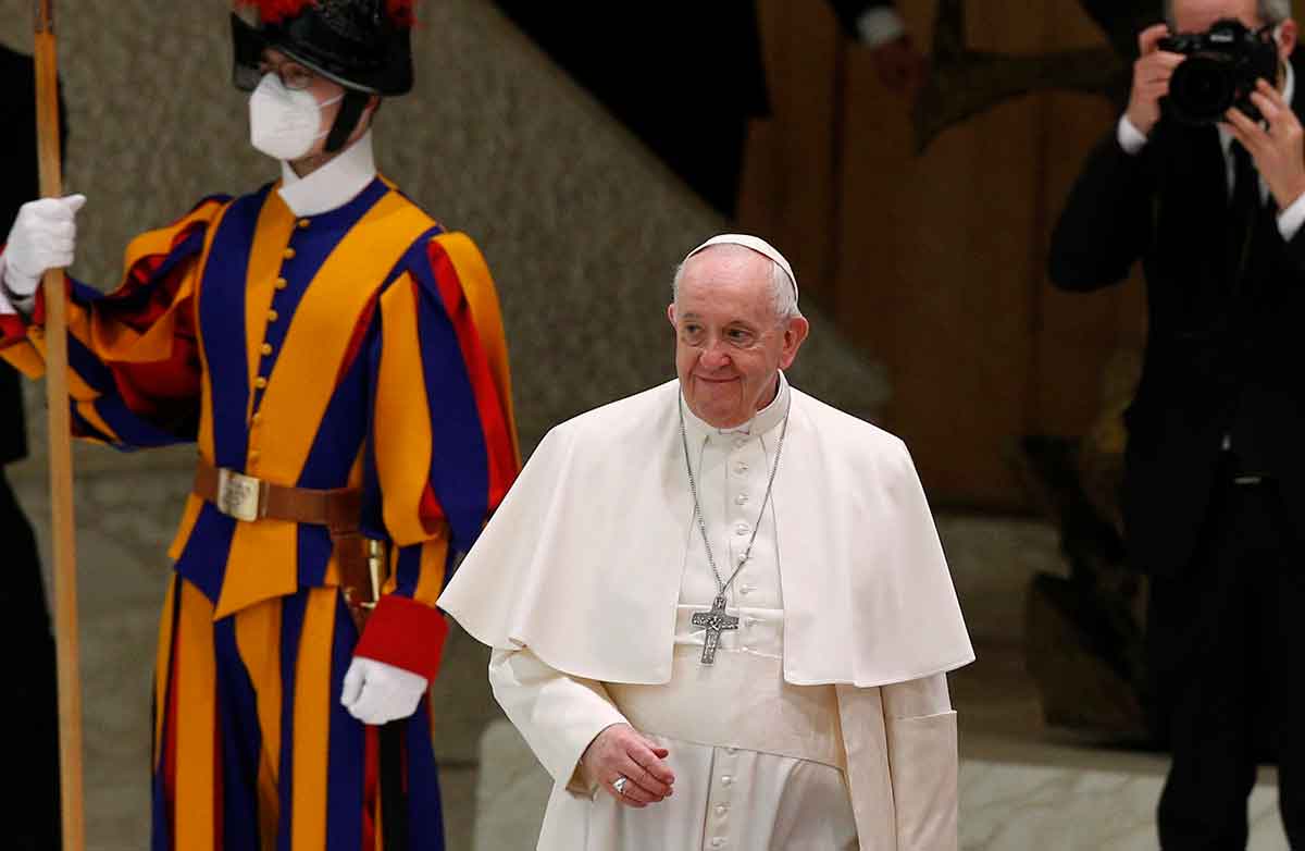 Pope Francis walks near a Swiss Guard as he arrives for his general audience in the Paul VI hall at the Vatican Feb. 9, 2022. (CNS photo/Paul Haring)
