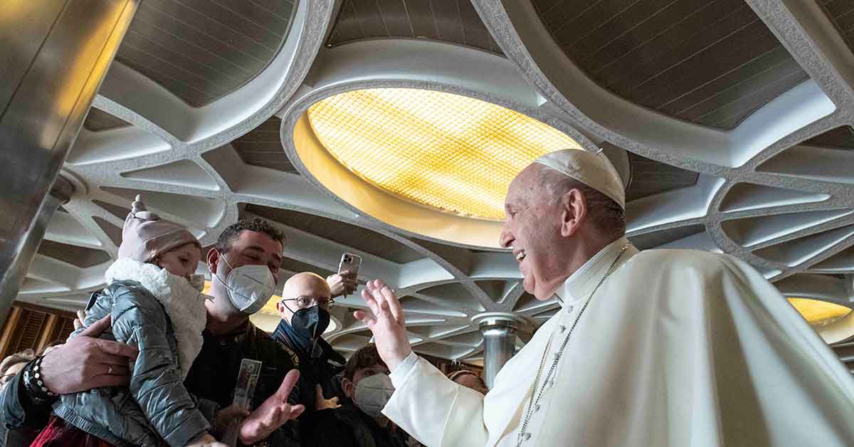 Pope Francis greets people during his general audience in the Paul VI hall at the Vatican Feb. 2, 2022. (CNS photo/Vatican Media)