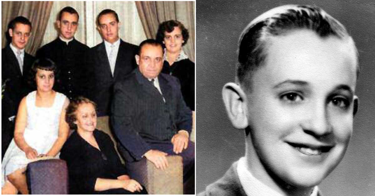 From left: Colourised photo of the Bergoglio family, with the future Pope Francis as a newly-ordained priest second from left at back • The young Jorge Mario Bergoglio as a boy (CNS photo/Clarin handout via Reuters)