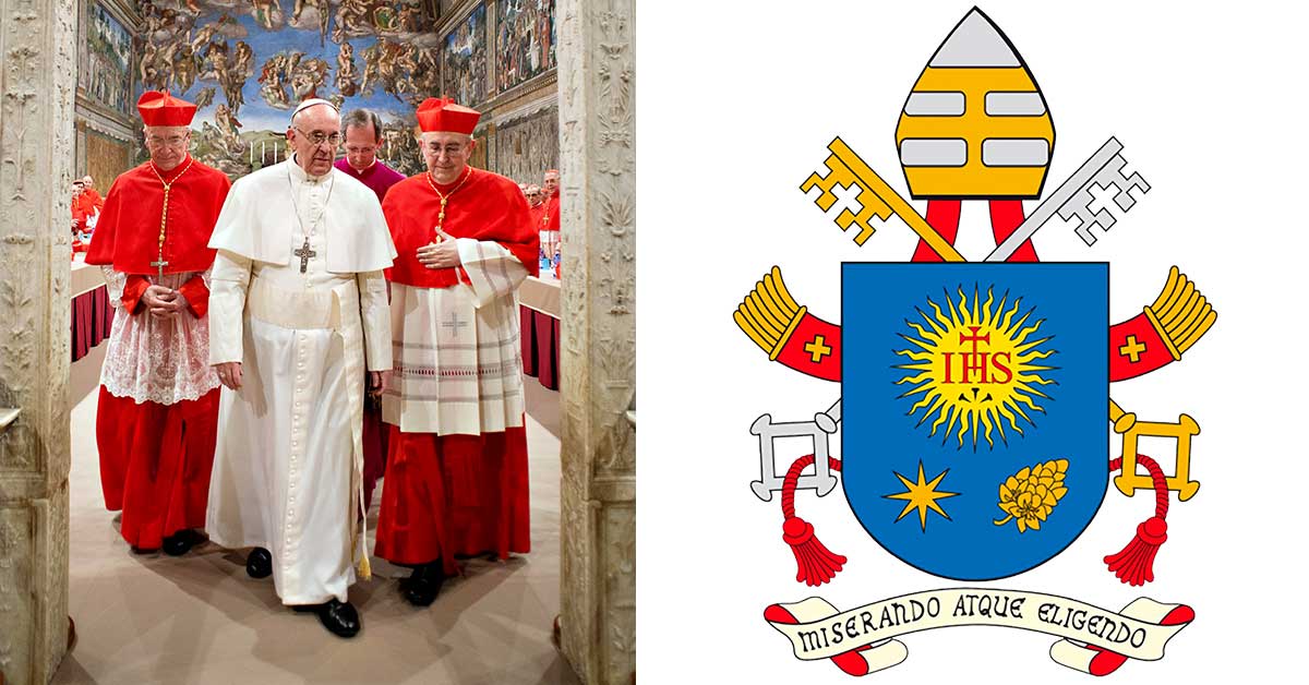 (Left) Pope Francis exits the Sistine Chapel after his papal election on March 13, 2013 (CNS photo/L’Osservatore Romano) • Pope Francis’ papal coat of arms