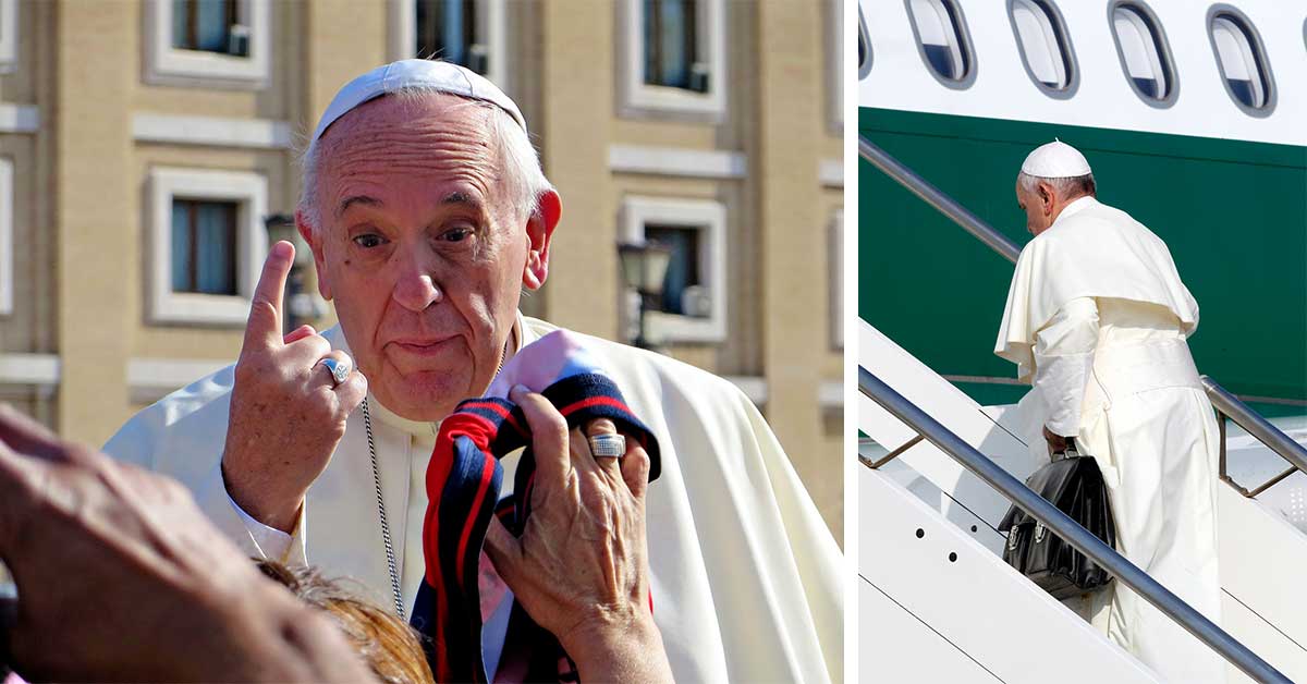 (Left) We are No.1, Pope Francis signals to fans of his favourite football club, San Lorenzo, during a general audience in 2015. (Photo: Günther Simmermacher). (Right) The pope carries his own bag as he boards a flight in 2014. (CNS photo/Giampiero Sposito, Reuters)